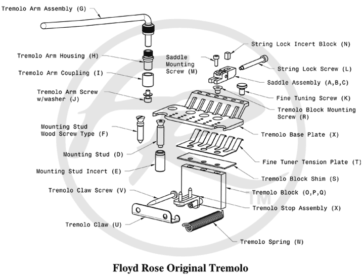 Before diving into specifics, here’s a diagram of the parts of a double-locking tremolo system to help clarify what I’m describing:
